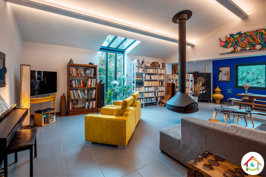 L’espace salon de la maison est divisé en deux parties. L’une, centrée dans l’espace autour du poêle à bois, profitant de toute la lumière que la pièce peut offrir. L’autre, plutôt déportée dans un coin de la pièce créant un espace de télévision avec deux fauteuils jaunes.